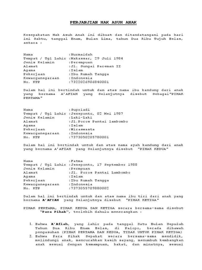 Tinjauan yuridis tentang perjanjian pengangkatan anak dan. Contoh surat perjanjian hak asuh anak pada umumnya hak asuh anak akan langsung jatuh ke tangan sang istri atau ibu ketika pasangan atau orang tua memilih jalan perceraian dan anak masih tergolong masih sangat kecil. 14+ contoh surat pernyataan hak asuh anak setelah perceraian background. These are so many great picture list that may become your creativity and informational reason for contoh surat perjanjian cerai dan hak asuh anak design ideas for your own collections. Contoh surat perjanjian hak asuh anak | pada umumnya, hak asuh anak akan langsung jatuh ke tangan sang istri atau ibu ketika pasangan atau orang tua memilih jalan perceraian dan anak masih tergolong masih sangat kecil.